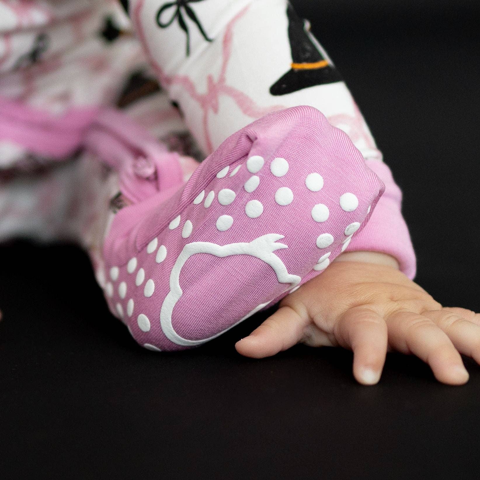A little bit spooky, a whole lot sweet! Our Sweet Salem Halloween Romper is made from our signature buttery-soft bamboo fabric, keeping your little one cozy and comfy from the pumpkin patch to bedtime snuggles. With charming black cats, witch hats, and pastel bows on a soft pink background, this romper brings a playful twist to Halloween style.