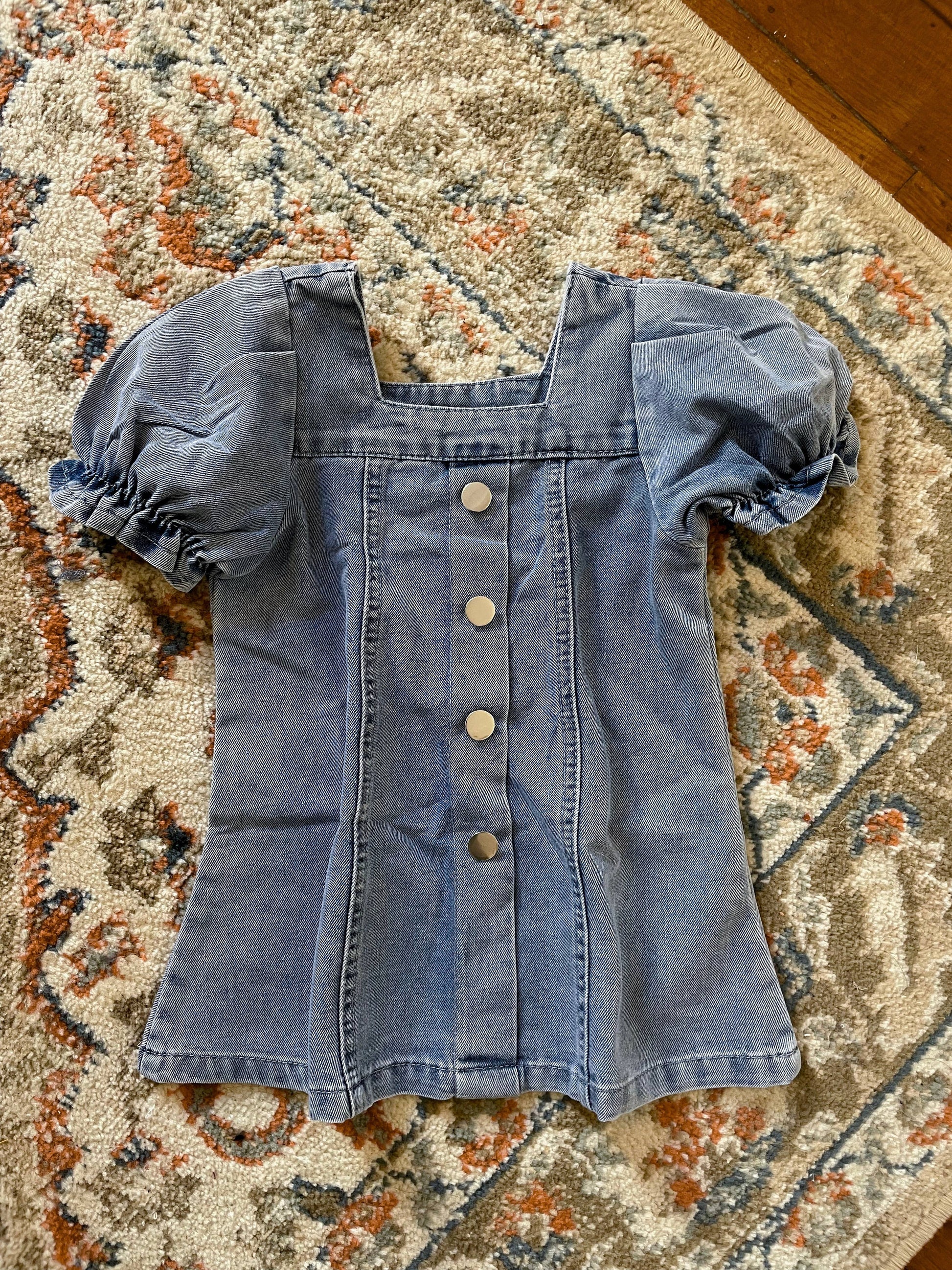 It has washed denim blue colour with short puffed sleeves. It has square neckline and front buttons as accessories.